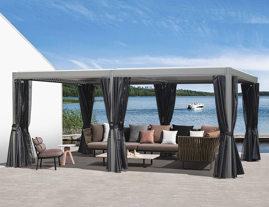 This large, modern pergola redefines outdoor luxury with its sleek black frame and adjustable roof panels. It comes with integrated gutters that direct rainwater efficiently, keeping the area below completely dry.