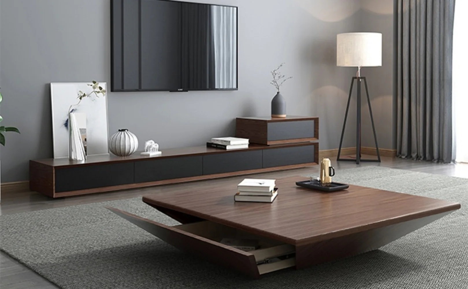 Benefits/use-cases: Provides both a central table surface and a TV/display unit that shares the same aesthetic language, helping unify the space. The matte finish and wood texture balance warmth and simplicity.
